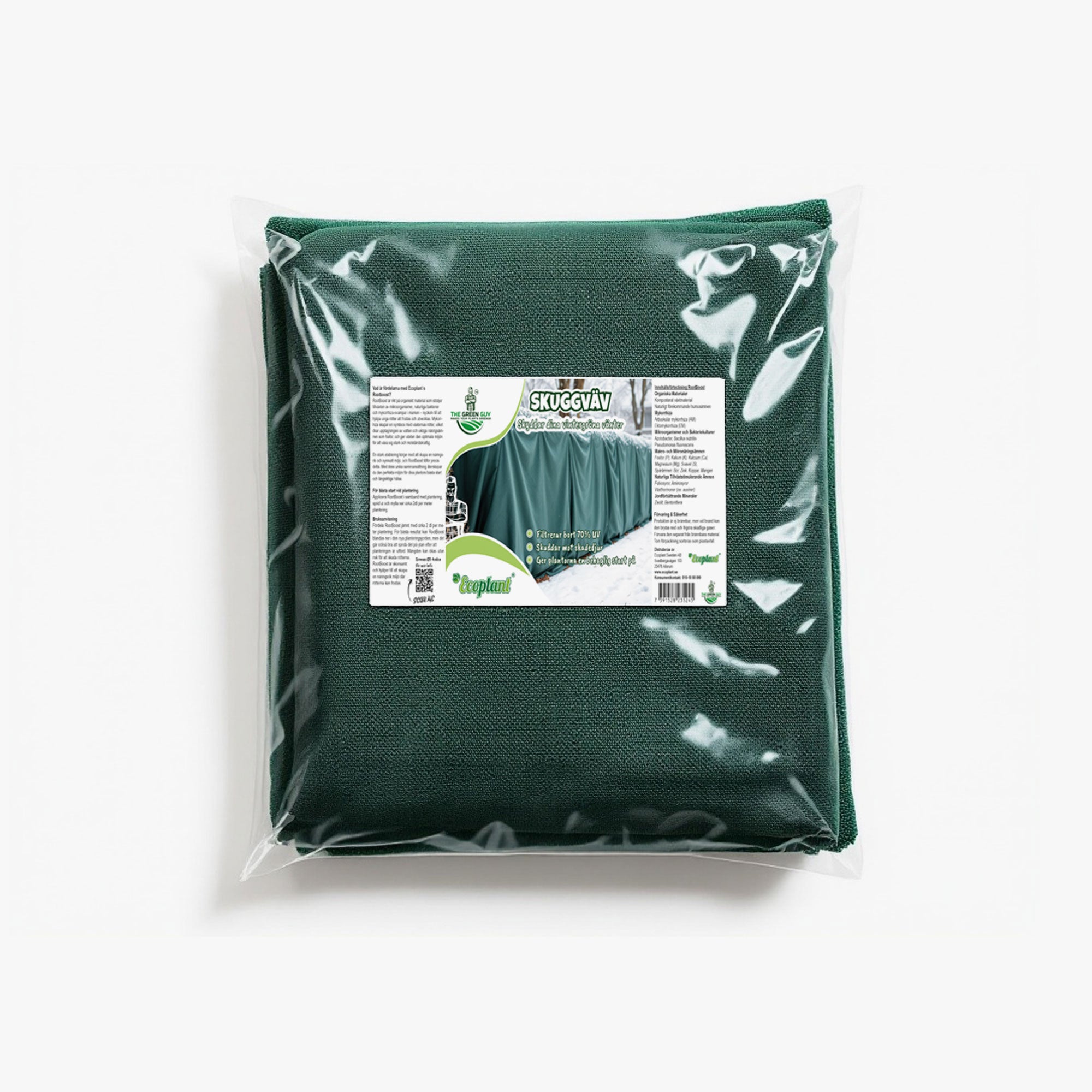 Ecoplant’s skuggväv är framtagen för att skydda – inte bara täcka. Den grova, slitstarka texturen står emot väder och vind, medan den sömlösa konstruktionen eliminerar svaga punkter där kyla, skadedjur eller sol kan tränga in. Resultatet är ett jämnt och tillförlitligt skydd från topp till rot.